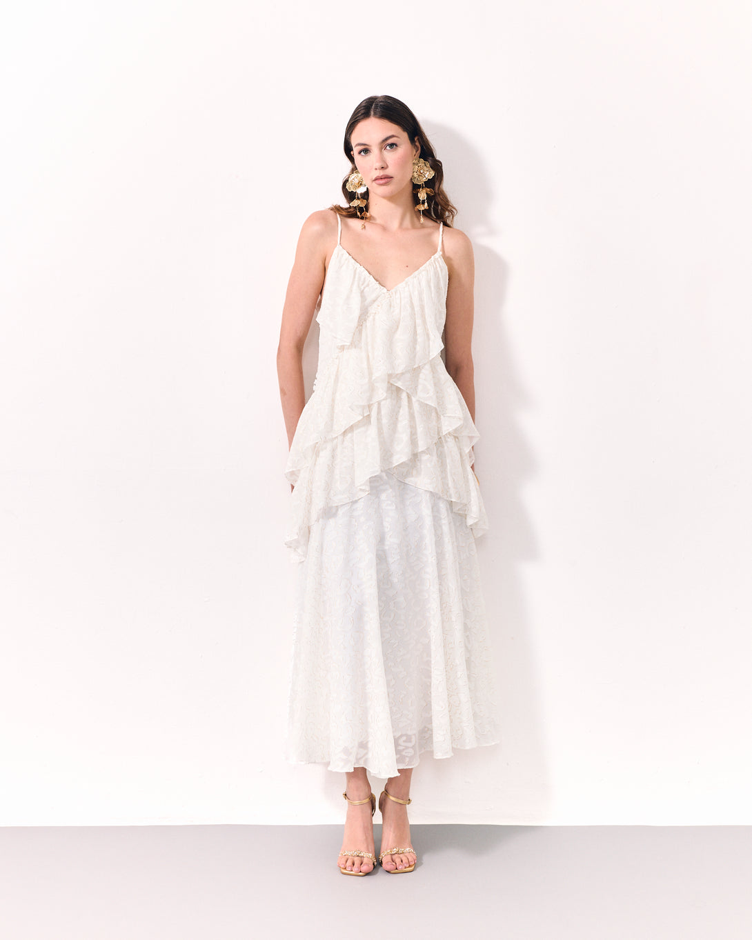 Vestido confeccionado em tecido devore com estampa animal print e detalhes metalizados. A peça solta ao corpo possui decote em “V”, alças finas, comprimento longo e fechamento lateral por botões.
